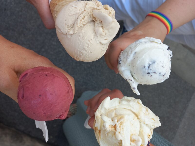 Ananas Basilikum, Erdbeere Ingwer, Schokolade, Stracciatella, Nocciola, Zitrone oder Vanille. Im Cornet oder im Becher. Eine oder drei Sorten. Wer die Wahl hat, hat das Glück.
